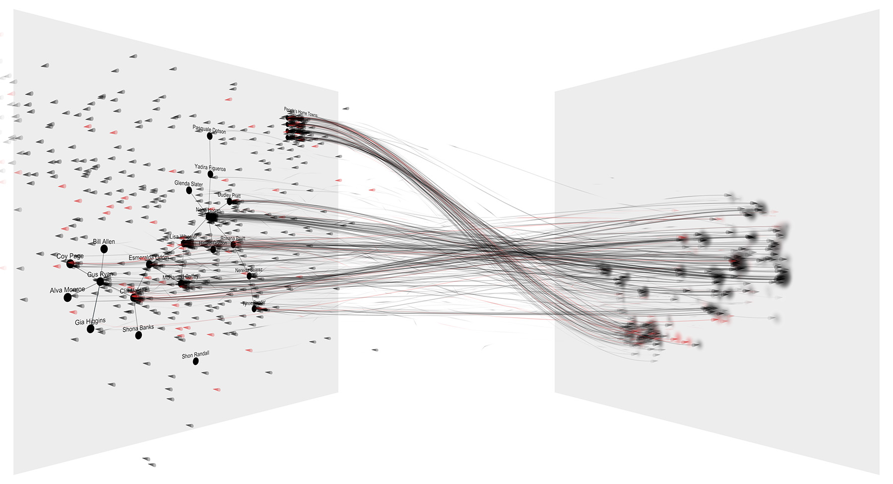 The fundamental data units of the installation are mouse trajectories. Each trajectory is a sequence of mouse movements and annotations performed while a person interacts with a network visualization to complete a given task, such as finding the shortest path between two nodes. Mouse trajectories can provide insights into the mental processes of people making decisions regarding workflow or trying to comprehend the structure of networks. A dataset of 9,600 mouse movement trajectories from a large-scale cognitive experiment with 600 Amazon Mechanical Turk participants was used. In the experiment, each participant was asked to perform 16 question-answering tasks on one of two networks of different sizes and one of three visual representations. Specifically, these were a node-link graph, a matrix ordered by group and a matrix ordered by node degree.